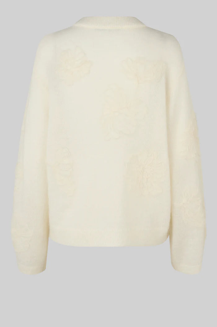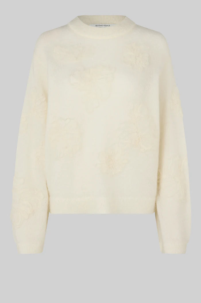 The Second Female Bellarose tofu knit with 3D mesh flowers. The knit is made from a soft and stretchy mohair blend. Key features include a round neckline and dropped shoulders with long, wide sleeves, ribbed neck and cuffs. The knit is intended for a relaxed look and looks perfect styled with the Shiny sequin skirt for Autumn events or pair back with denim for a more low key look.