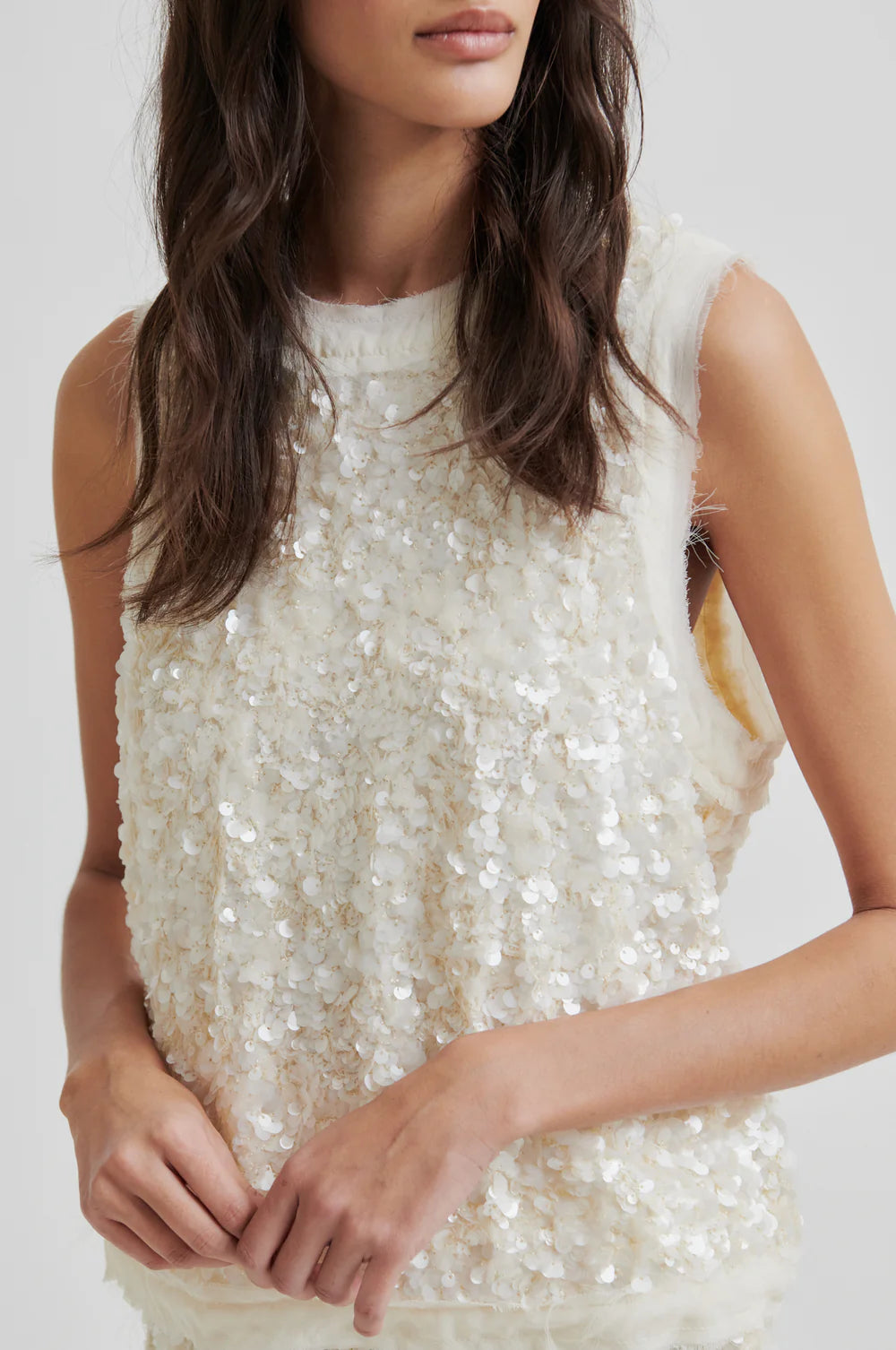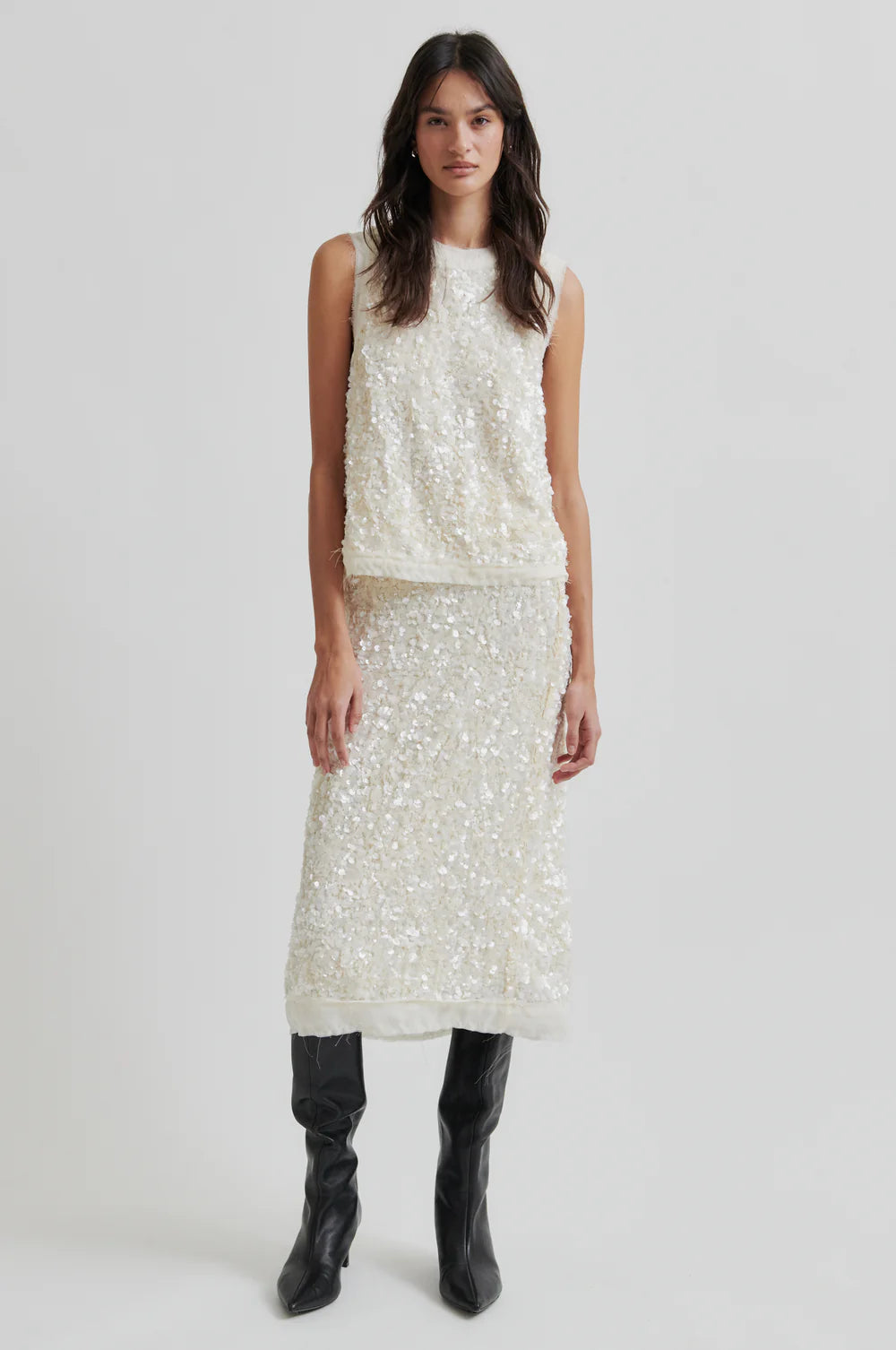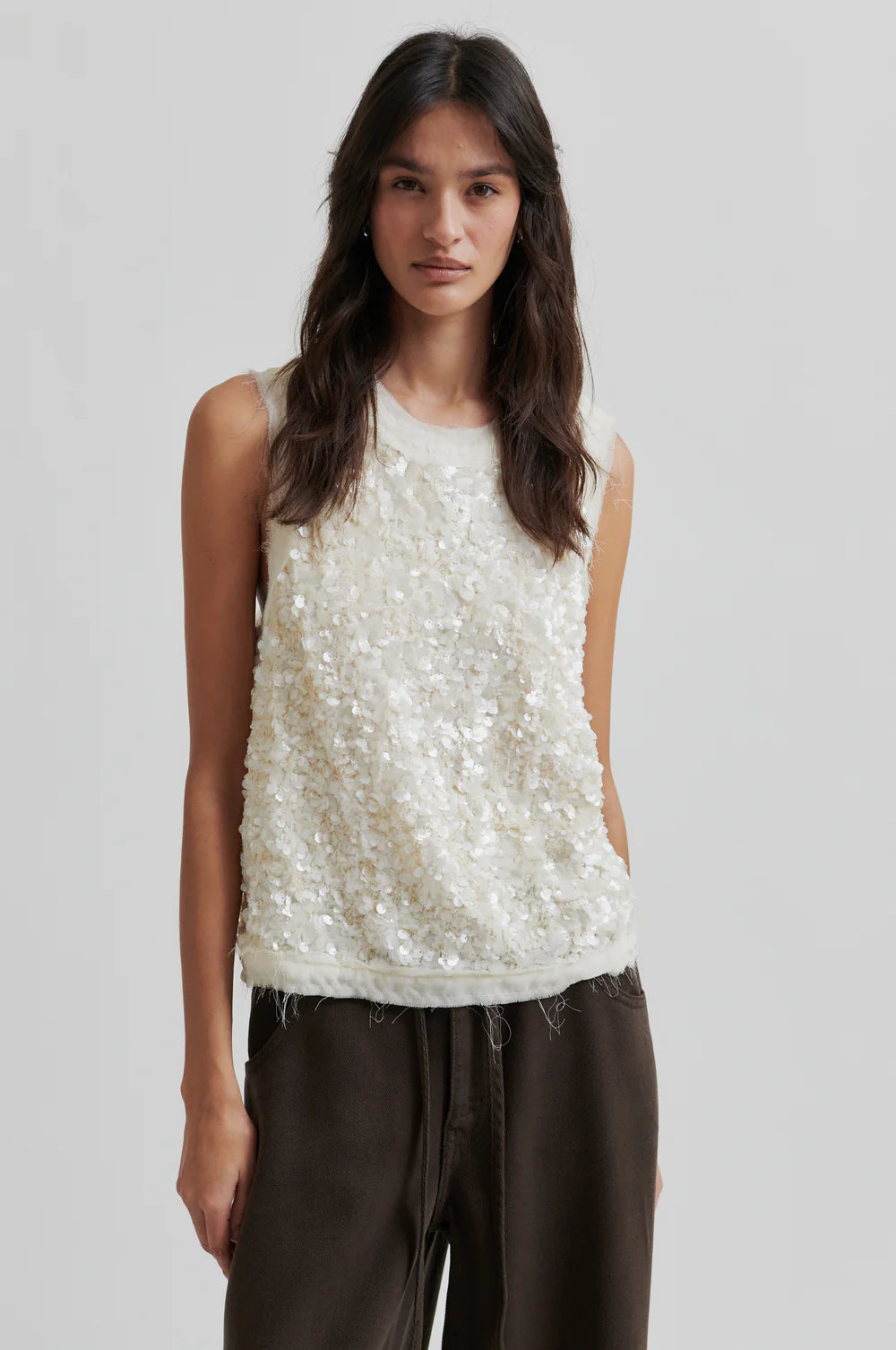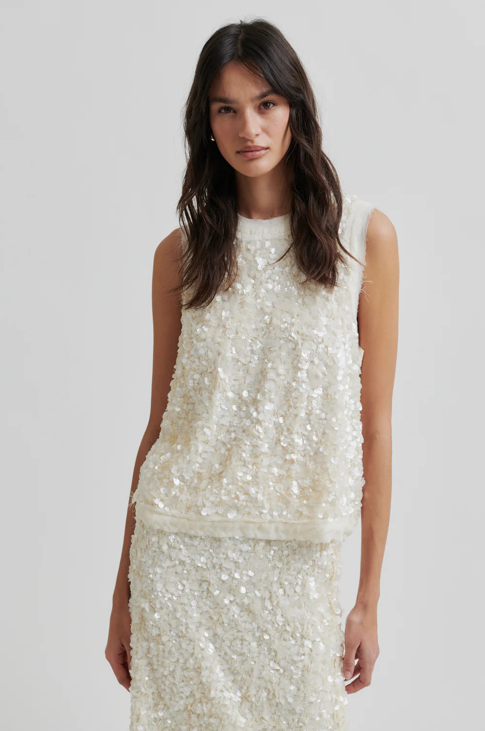 Add some sparkle to your wardrobe with the tofu Shiny sequin top from Second Female. This sleeveless top features a round neck and chiffon trimmed waistband. Style back with denim and tailoring or for an event team with the matching skirt.