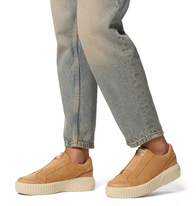 Introducing the Ona Ave tawny suede leather slip on trainers from new season Sorel. These trainers are the perfect pairing for everyday wear. They have a chunky moulded EVERTREAD rubber sole and removable EVA footbed with removable cover.